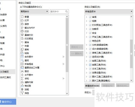 - 进入自定义功能区,选择所有选项卡并点击切换即可。