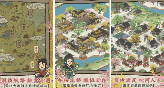 创新水墨风格主题的游戏世界,以独特的放置玩法体验江南水乡的风光。手绘风格完美复刻了江南的美丽景色与生活气息,无论是自然景观还是人文环境都栩栩如生。玩家可以扮演城市设计师,规划布局和建造建筑,让城市逐渐繁华富饶。游戏中有大量的NPC角色,包括工部官员、西域商人等,解锁任务完成后还能解锁剧情故事。