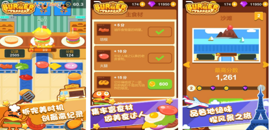 这款游戏以汉堡为主角,玩法简单却独具特色。每当屏幕上方掉落美味汉堡时,玩家需用滑动手势将其叠加起来。每成功叠加一个汉堡即可获得分数提升。最终,谁能在最短时间内累积更高的得分呢?快来挑战吧!