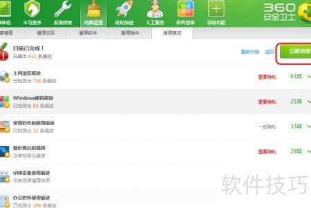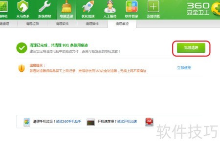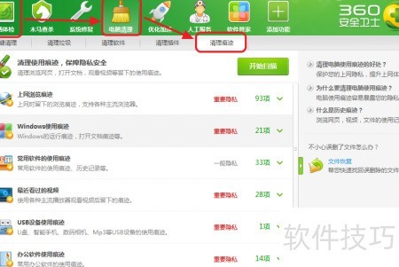 点击右下角“全卫士”,进入主界面,选择“电脑清理”功能,切换到“清理痕迹”选项,开启扫描和移除程序、残留文件及垃圾数据的功能。