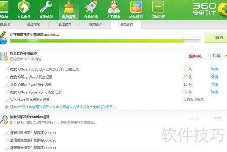 备全方位的痕迹清理功能,涵盖上网记录、Windows操作、常用软件、观看视频历史、USB设备使用、办公软件操作以及搜索引擎Cookies等七大类别,全面覆盖电脑使用的各个场景。只需轻轻点击开始扫描,即可迅速检测并清除各类使用痕迹,有效保护个人隐私和系统安全。