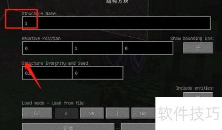 3、 接着放置一个加载模式的结构方块,在其结构名称栏输入1,随后点击加载按钮即可完成操作。