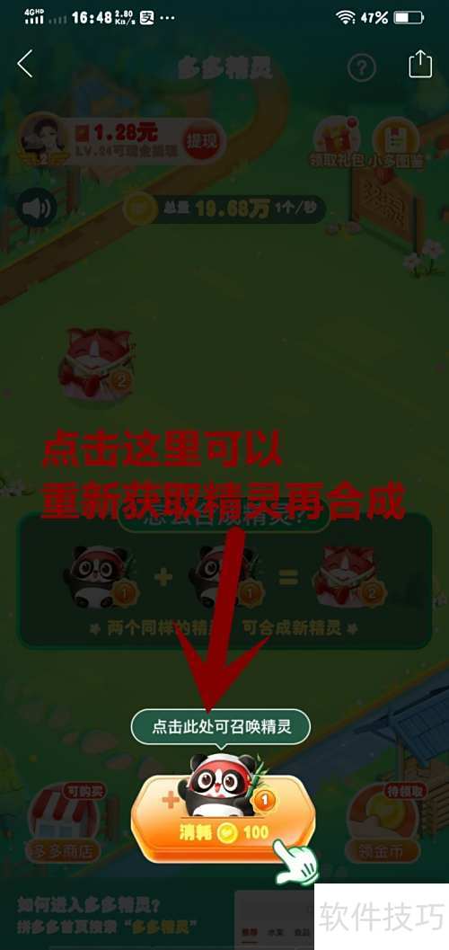 登录软件后,打开搜索栏输入多多精灵,即可直达相关页面。它能产出金币,可用于购买新精灵,同等级的两只精灵还能合成更高级的版本。