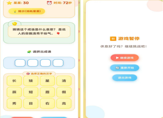 专为成语爱好者设计的知识型智力手游,玩法新颖且充满挑战性。在游戏中,你需在限定时间内准确填写成语,部分关卡要求从一段冗长的文字中提炼出正确的成语表达;另一些则通过描述含义来推断对应成语。这种多维度的考验方式不仅能稳固你的成语储备,还能提升语言理解和逻辑推理能力,适合作为希望提升语文素养玩家的长期体验项目。