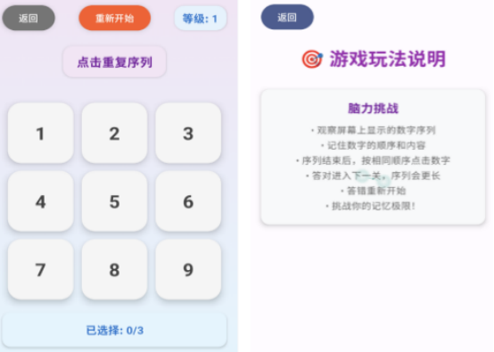 这款游戏不需要网络连接,只需借助您的指尖和耐心就能畅享无穷的乐趣!它是一款充满挑战的数字序列记忆游戏,旨在提高您的注意力集中能力和瞬间记忆力。游戏规则非常简单:屏幕上会出现一组随机排列的数字,您需要快速点击相应的方格,按照顺序还原它们的位置。初段关卡相对轻松,但随着难度升级,方块的数量和布局都会变得更加复杂。这款游戏完美地锻炼了大脑的反应速度,适合所有年龄段人士挑战自己的极限!