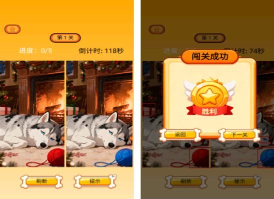 尝试一款采用卡通画风的找差异类益智游戏!游戏包含丰富多样的关卡设定,每一关都提供两幅高度相似的图片。你必须在倒计时结束后找出所有细节上的不同之处比如颜色变化、物品缺失或位置偏移等。这不仅考验你的观察力和逻辑思维能力,还为以上的人群带来了不小的挑战。成功通关后,你可以获得奖励,用于推动“拯救小狗”的主线任务中。这款游戏的乐趣与成就感兼具,绝对值得一试!