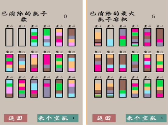 该游戏的灵感源自于现实中的颜色分类益智玩具,通过直观的游戏设计和高度策略性的玩法,使玩家在操作过程中既轻松又具有挑战性。屏幕中,瓶子里盛有不同的液体,玩家需要将相同颜色的液体归类合并,最终实现每个瓶子只有一个色彩并清空多余的容器。游戏提供了一种成长模式与无限挑战两种玩法方式。随着关卡的推进,颜色种类和复杂度会逐步增加,对观察能力和规划思维提出更高的要求。这样的设计非常适合在任何场景下进行脑力训练。
