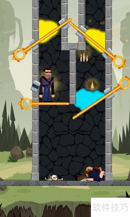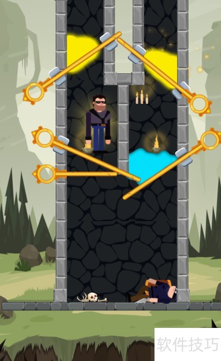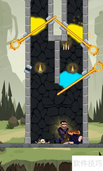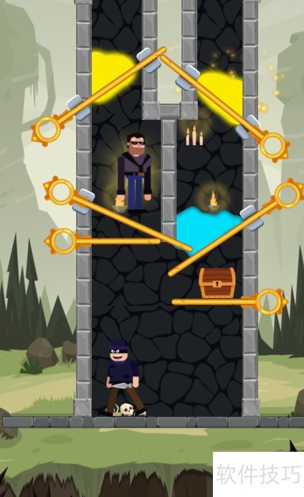 本关目标是开启宝箱,中年男士在水面左方,强盗在下方,详图如下。