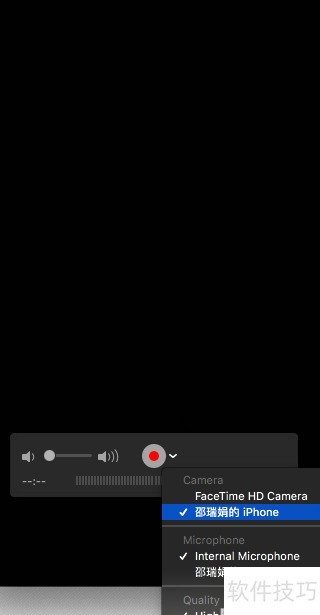 启动屏幕录制功能。 点击红色按钮旁边的下拉菜单。 选择你的iPhone设备。 开启手机并确保QuickTime能够监测到屏幕变化,这样就能实现实时显示和镜像投屏的效果。