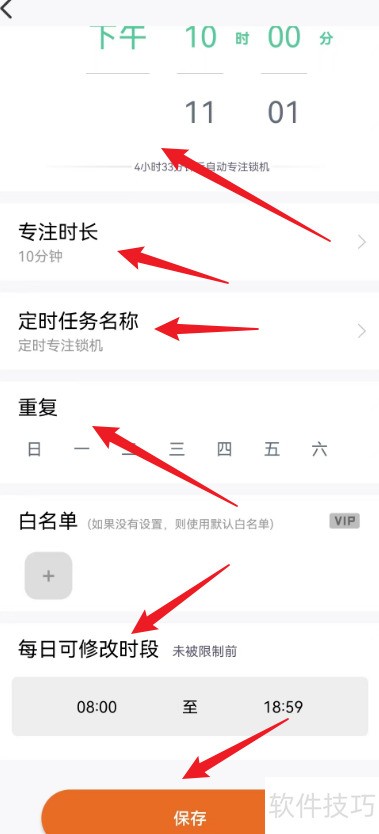 轻松创建个性化定时任务!只需设置开启时间、专注时长、指定任务名称及重复周期,然后点击“保存”完成。每天的时段也可以灵活调整,让你的专注时光自由安排。