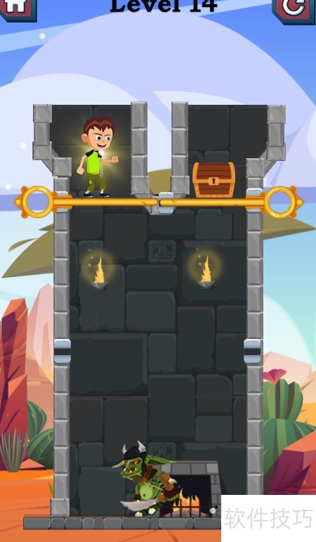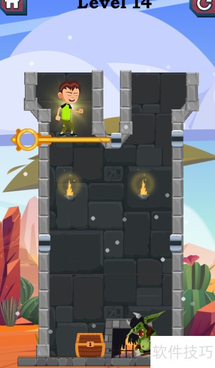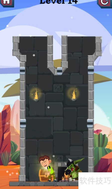 - 本关需利用宝箱击败怪物士兵,清除两个位于直线上的横插销,具体操作所示。
