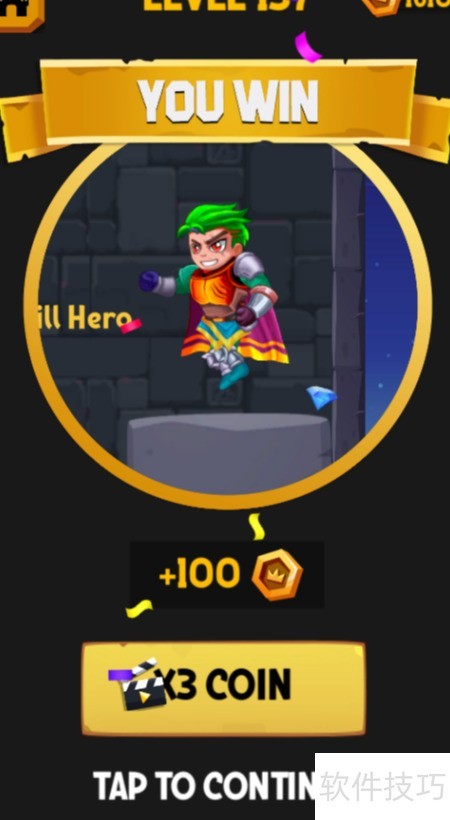 - 少年顺利获得金币,屏幕上显示YOU WIN,所示,成功通过关卡。