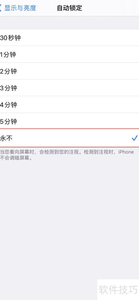 - 将自动锁屏时间设为永不,设置后苹果手机将不再自动锁屏。