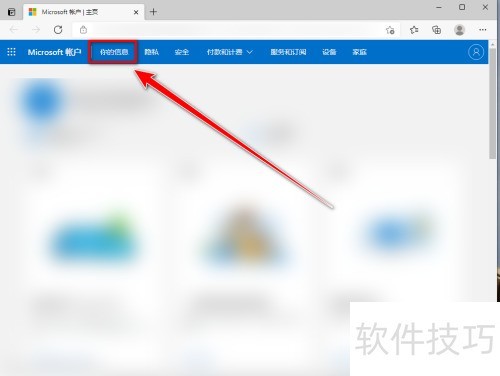- 登录微软账户,进入页面后点击顶部导航栏的你的信息选项。