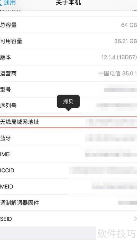 - 长按设备上的Mac地址,直至弹出拷贝选项,即可轻松将iOS设备的Mac地址复制下来。