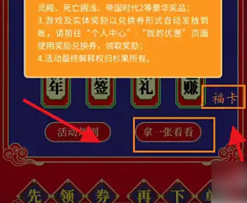 杉果游戏福袋怎么激活 杉果福袋激活方法 时间:2026-01-07 phigros正版 类型:仙侠魔幻 大小:2.24gb 语言:简体中文 评分: 查看详情 杉果游戏福袋怎么激活 杉果福袋激活方法 第一步,首先打开游戏,选择“元旦篇”。 第二步,然后点击“杉果双旦大促”活动。 第三步,再选择“福签”。 第四步,接着打开“活动规则”。 第五步,然后选择“拿一张看看”,获得“福卡”。 第六步,最后使用“福卡”,就可以激活福袋了。