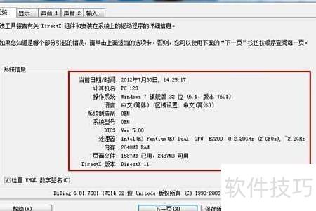 启动DirectX诊断工后,在系统选项卡下可浏览电脑基本配置信息。