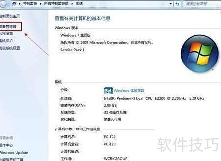 - 进入计算机属性,点击左侧蓝色区域中的设备管理器选项。