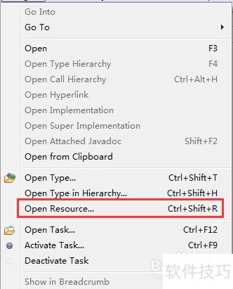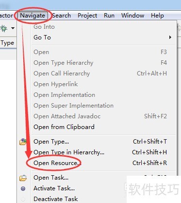 - 启动Eclipse后,在主界面找到并点击Navigate菜单,随后在下拉选项中选择Open Resource...功能。