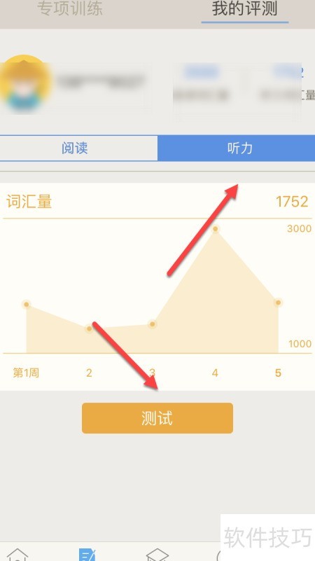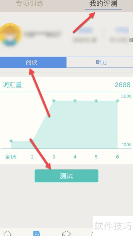 - 点击我的评测、阅读或测试功能,即可检测自身阅读能力,具体操作所示。