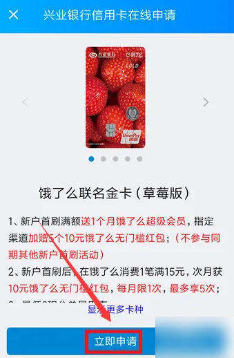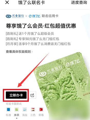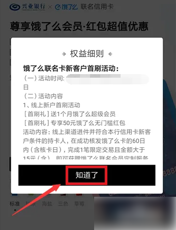 饿了么怎么办信用卡 饿了么联名卡申请方法 打开饿了么APP,点击“我的”。 我的界面,点击“饿了么联名卡”。 进入饿了么联名卡,点击“查看具体权益规则”。 阅读权益规则,点击“知道了”。 返回界面,点击“立即办卡”。 进入申请界面,点击“立即申请”。 最后,输入个人信息,按步骤填写资料审核通过即可。