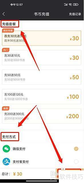 - 进入书币充值页面,选择套餐与支付方式,点击立即充值按钮即可完成操作。