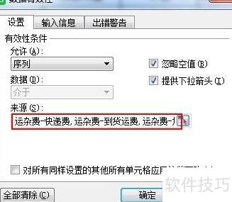 在创建模版时,在费用列中设定数据验证规则,勾选序列选项,从来源区域导入费用项列表,并使用英文逗号进行分隔。