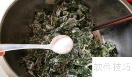 将菜叶均匀抓拌,覆盖薄层面糊,轻轻抖去残留,防止面粉过多造成菜品不软嫩。