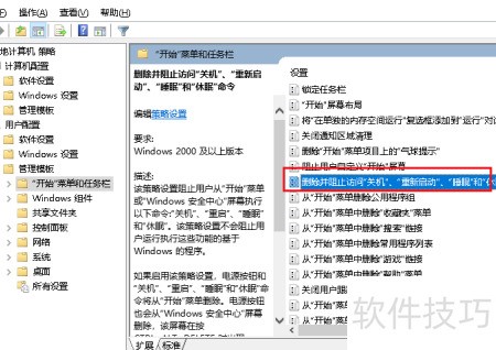 - 在右侧找到删除并阻止访问关机、重启、睡眠和休眠选项,双击进入设置。
