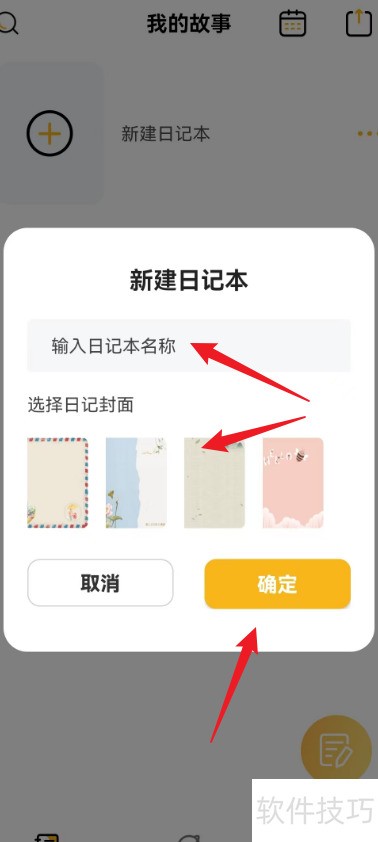 - 进入新建日记页面,填写名称并选择封面后点击确定即可完成创建。