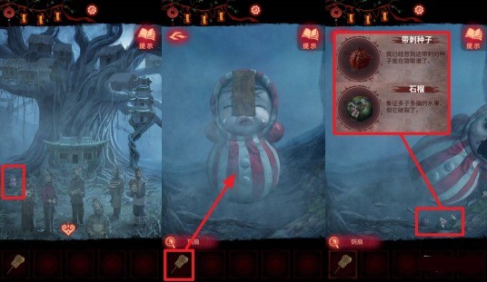 切换到聂莫黎视角,来到树根区域,在树根左侧树下之前被埋在土里的不倒翁现在已经起来了。在道具栏选择铜扇点击不倒翁,触发小游戏。先看不倒翁上贴的符咒晃动方向,然后点击对应的方向按键晃动不倒翁。如果觉得麻烦可以跳过这个步骤。完成小游戏后获得带刺种子。