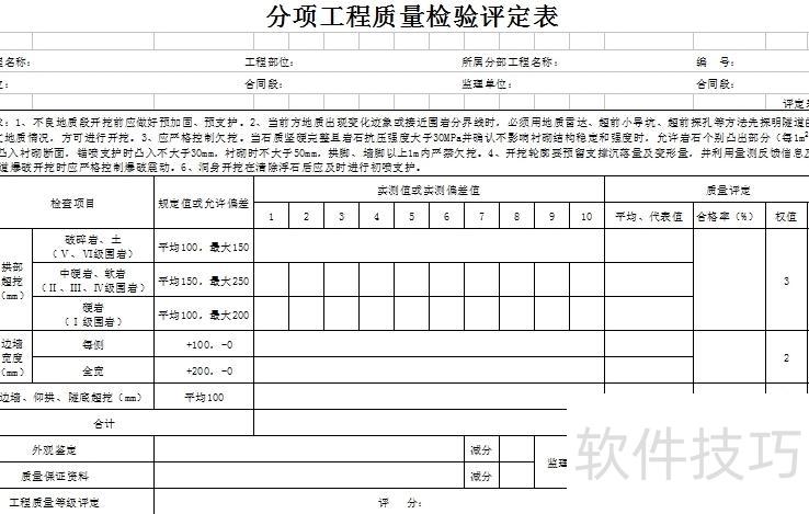 隧道工程涵盖了多个子项目,每项都有对应的工程质量评估清单。这些表格构成了最终工程档案中至关重要的一部分,直接反映了施工质量和验收情况。
