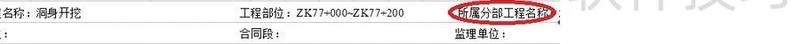 因此,对于属于洞身开挖分部工程中的某项具体工作,应当明确其所在的具体分部工程名称。 由于该分项工程的分部工程名为“洞身开挖”,因此应填“洞身开挖”作为所属分部工程名称。