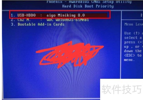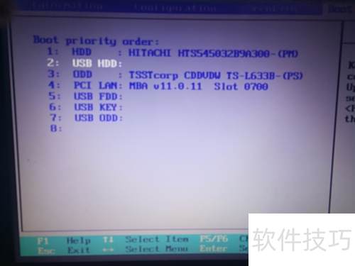 在BIOS设置中使用FF更改启动顺序,不同版本的BIOS可能需要特定热键。确保按照屏幕底端的指示操作,将USB驱动器置于最前。
