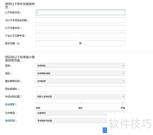 在Google高级搜索界面中,只需键入关键词即可快速定位相关网页;同时,利用“语言”、“地区”和“更新时间”选项细致调整检索内容,精准锁定目标信息。