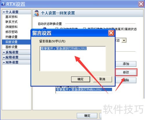 切换到设置界面,点击编辑选项,输入新消息回应,保存更新,然后确认无误后点击确定以完成更改。
