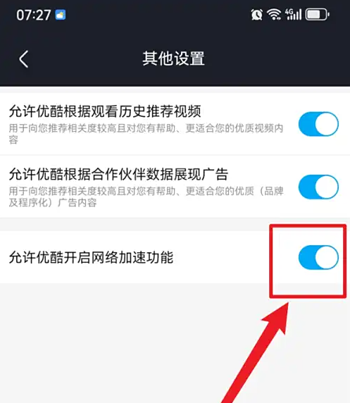 优酷免费版下载 类型:视频直播 大小:101.6m 语言:简体中文 评分: 查看详情 优酷播放器加速怎么设置 优酷视频开启网络加速方法 第一步:打开优酷视频,选择进入【我的】界面,点击【设置】。 第二步:进入设置界面,点击【其他设置】。 第三步:在其他设置界面,打开【允许优酷开启网络加速功能】右侧的开关。