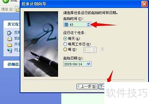 接着出现一个对话框,提示你输入开始和结束日期及时间。如果你希望从当前日期执行,无需选择日期即可设定时间为要启动的时段。例如,如果你想在每天早上自动运行程序,只需在时间选项中选中,然后确认无误后点击“下一步”按钮继续操作流程。整个过程简单明了,大大提高了设置定时任务的效率和便捷性。
