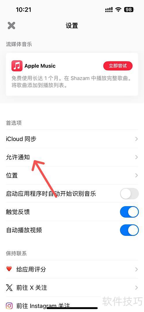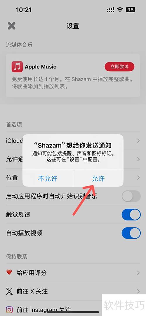 如何设置Shazam允许接收通知?