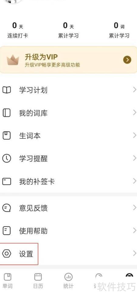 - 进入背单词页面,点击底部的设置选项。