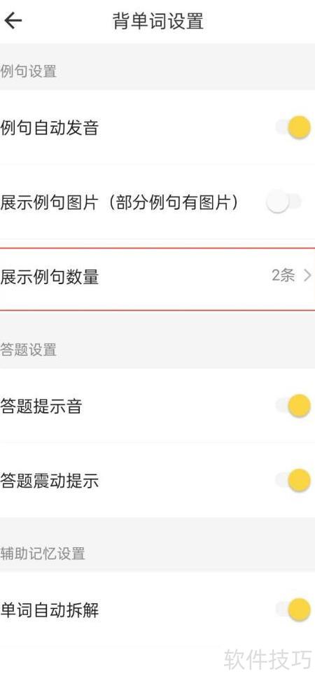 - 在背单词设置中,点击选择例句显示数量。