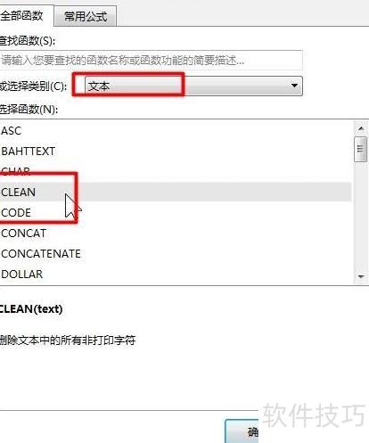 - 在函数分类中选择文本,于插入函数对话框内找到并选中CLEAN函数。