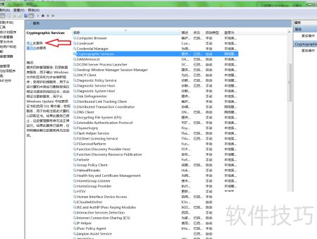 - 选中Cryptographic Services后点击停止按钮,即可关闭该服务。
