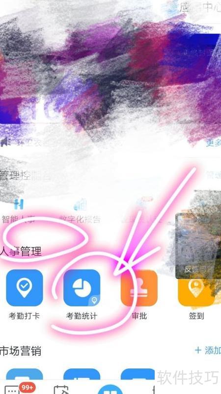 - 进入页面后点击中间菜单,找到人事管理下的考勤统计并选择。