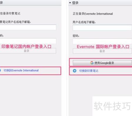 使用印象笔记国内账号时,在登录页面选择印象笔记入口;对于Evernote国际账号,需点击登录框下切换至Evernote International选项来完成登录。