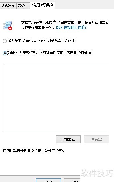方案当您的软件需要安装包时,请首先解压缩文件。然后,在“此电脑”中打开高级系统设置,并在“性能”选项卡下找到“数据执行保护”。接着,选择您希望添加的程序并将其加入其中。最后,重新安装您的软件即可完成配置。