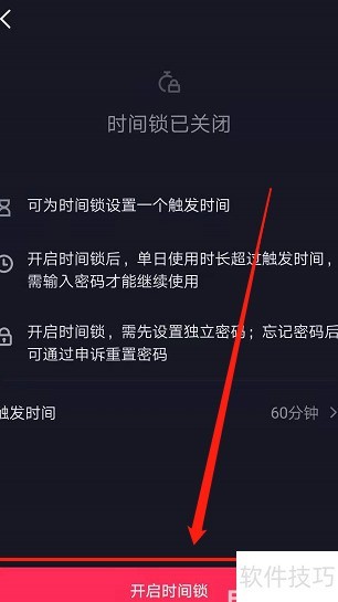 抖音时间锁开启指南 更新时间:2026-02-01 13:16:34 抖音时间锁开启指南 进入抖音后找到未成年保护功能,选择时间锁并开启即可完成设置。 - 进入抖音,找到并点击青少年保护功能图标 - 进入未成年人保护页面,开启时间锁定功能 - 进入时间锁页面,点击启动按钮即可开启(默认时长为60分钟)。