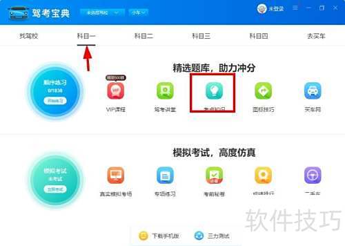 - 打开驾考宝典,首页即显示科目一和考点知识,点击即可进入学习。