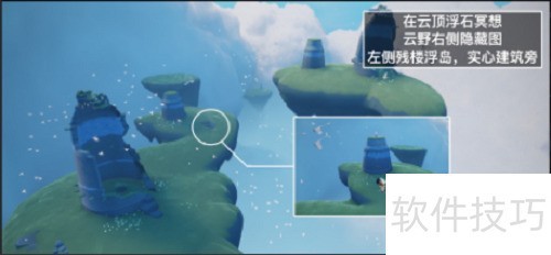 - 在云野右侧隐藏图左侧残楼前的实心建筑旁,于石碑前光圈处打坐冥想并留言。