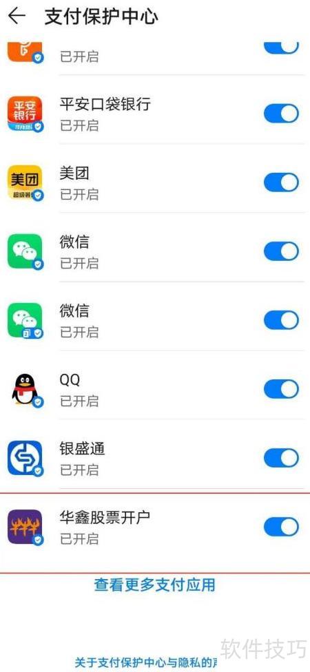 - 打开支付保护中心,找到华鑫股票开户选项,关闭其右侧的开关即可完成操作。
